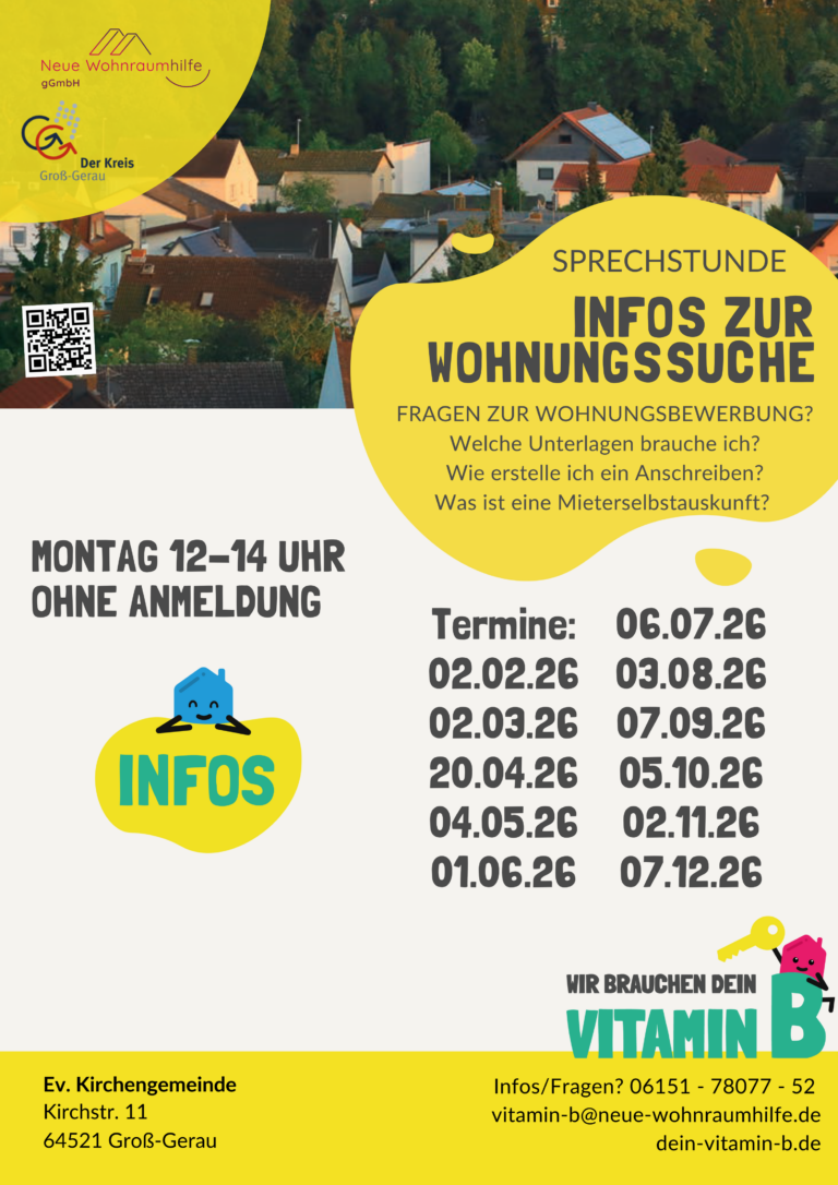 Bleib dran und erfahre mehr TErmine Telefonische Sprechstunde am FreitagBeratung und Infos zur Wohnungssuche Find out more 20 Februar 2026 10:00 - 12:00 TELEFONISCH ERREICHBAR, unter 06151-78077-20, Google Karte anzeigen Telefonische Sprechstunde am DienstagBeratung und Infos zur Wohnungssuche Find out more 24 Februar 2026 10:00 - 12:00 TELEFONISCH ERREICHBAR, unter 06151-78077-20, Google Karte anzeigen Telefonische Sprechstunde am FreitagBeratung und Infos zur Wohnungssuche Find out more 27 Februar 2026 10:00 - 12:00 TELEFONISCH ERREICHBAR, unter 06151-78077-20, Google Karte anzeigen Du möchtest DeinE WOHNUNG VERMIETEN?BITTE SCHREIB' UNS AN. Name Email Telefonnummer Message ABSCHICKEN Dein Kontakt TEAM Vitamin B Wir freuen uns auf Deinen Anruf!Freie Wohnung in Darmstadt? Melde Dich hier.E-Mail Adressekontakt@neue-wohnraumhilfe.de Impressum Datenschutz Impressum Datenschutz